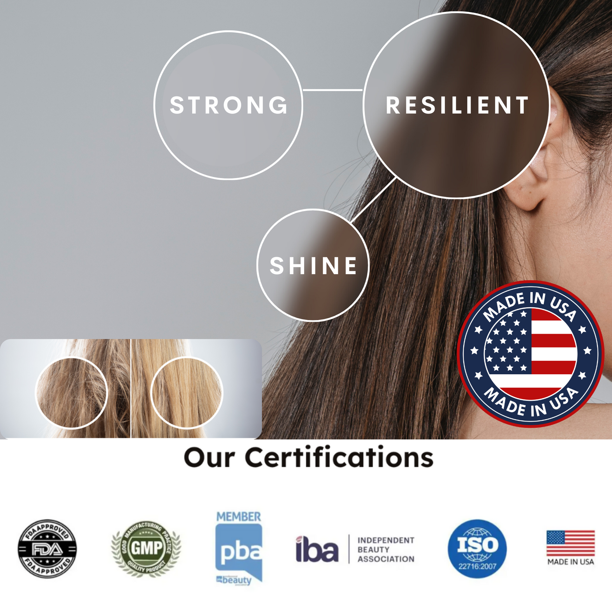 Keratin + Collagen – rebuild strength, elasticity, and resilience.